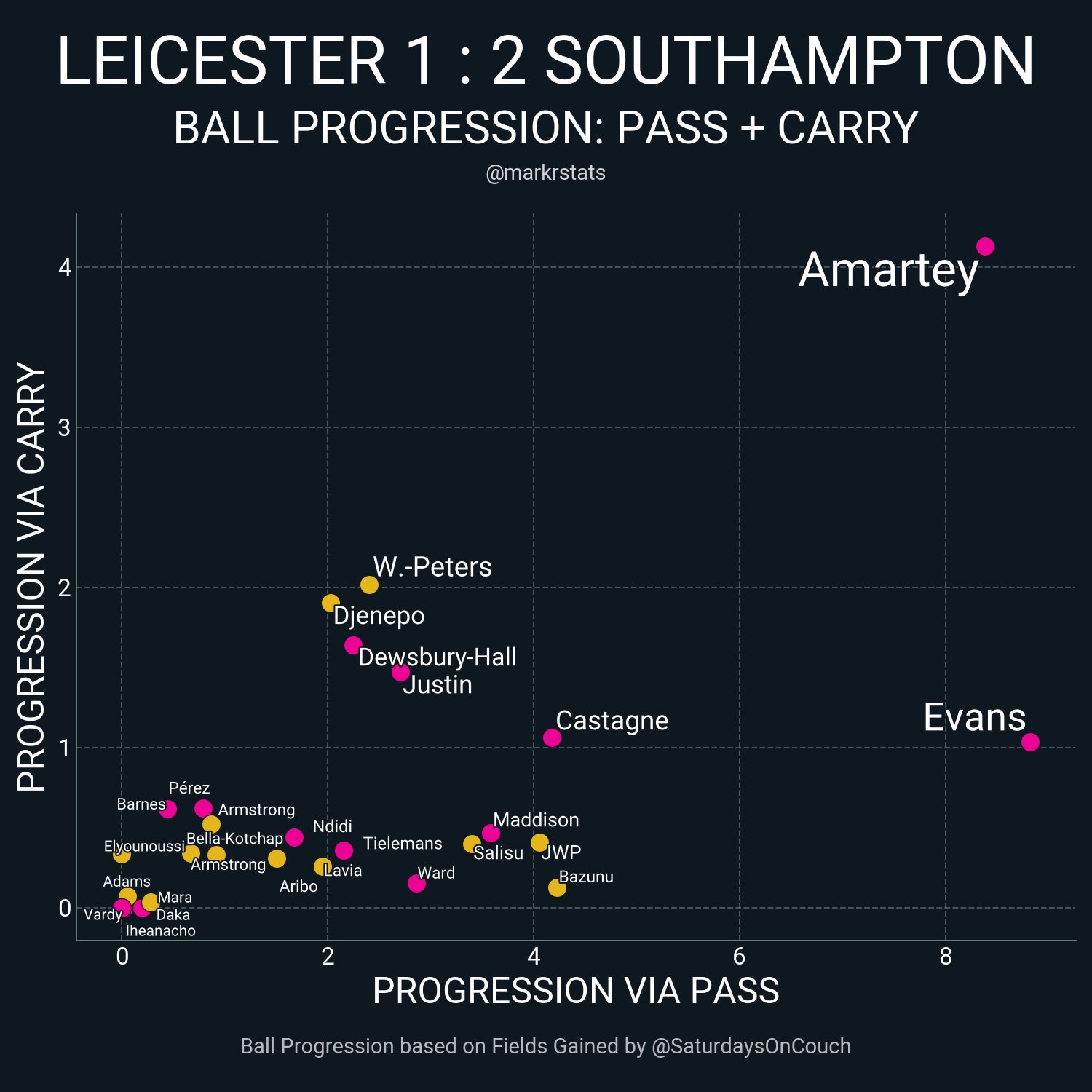 This graph shows us what each team does every time they have the ball. Top left means they pass it less and move up the field fast. Bottom right means they pass it more and progress slowly. Manchester City are obviously huge outliers here. After the Arsenal game, Leicester were even closer to them than we are now. Congratulations if you noticed the dramatic upturn in how direct we were against Southampton.
