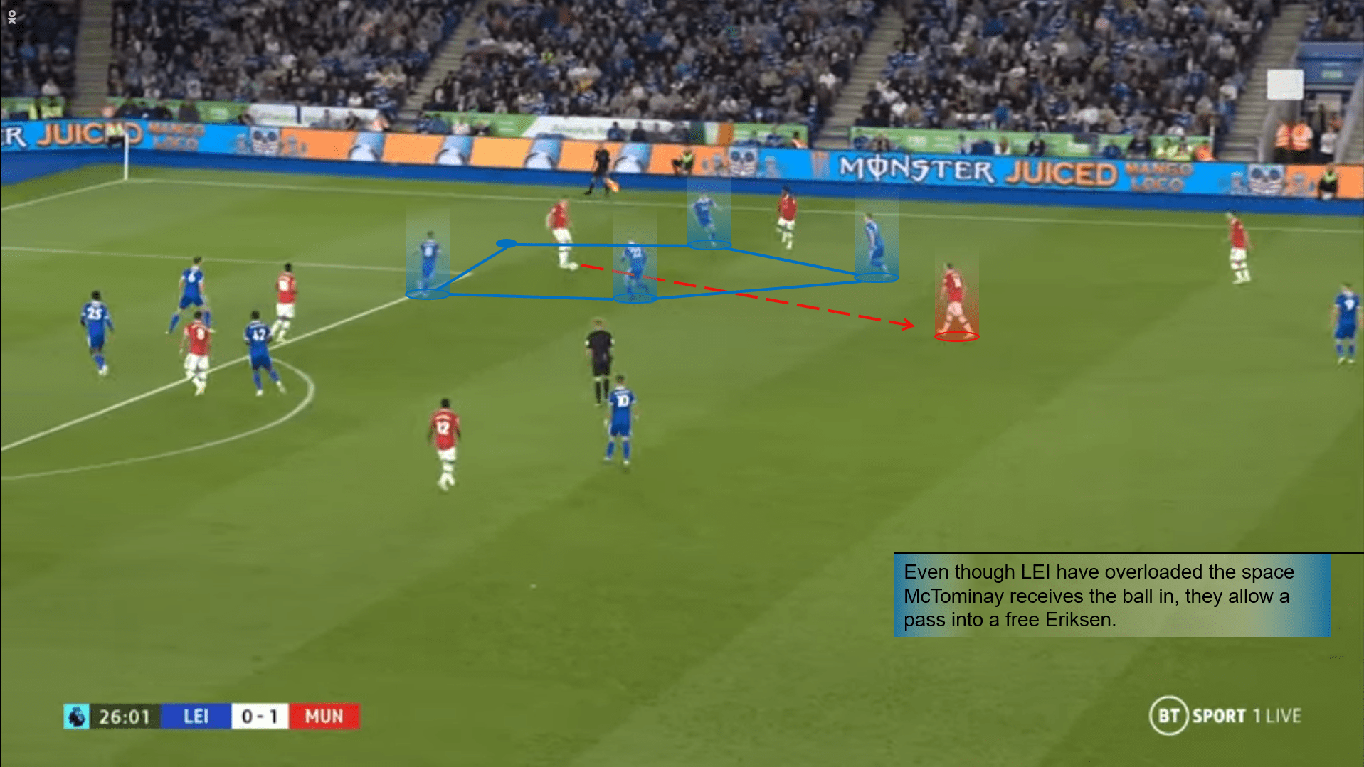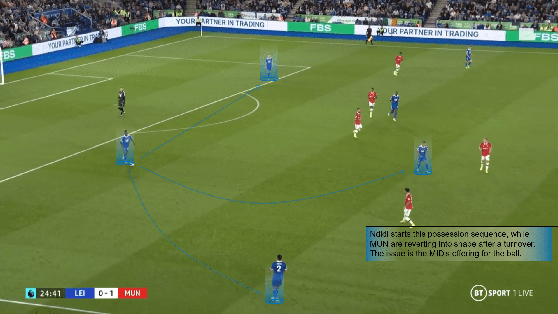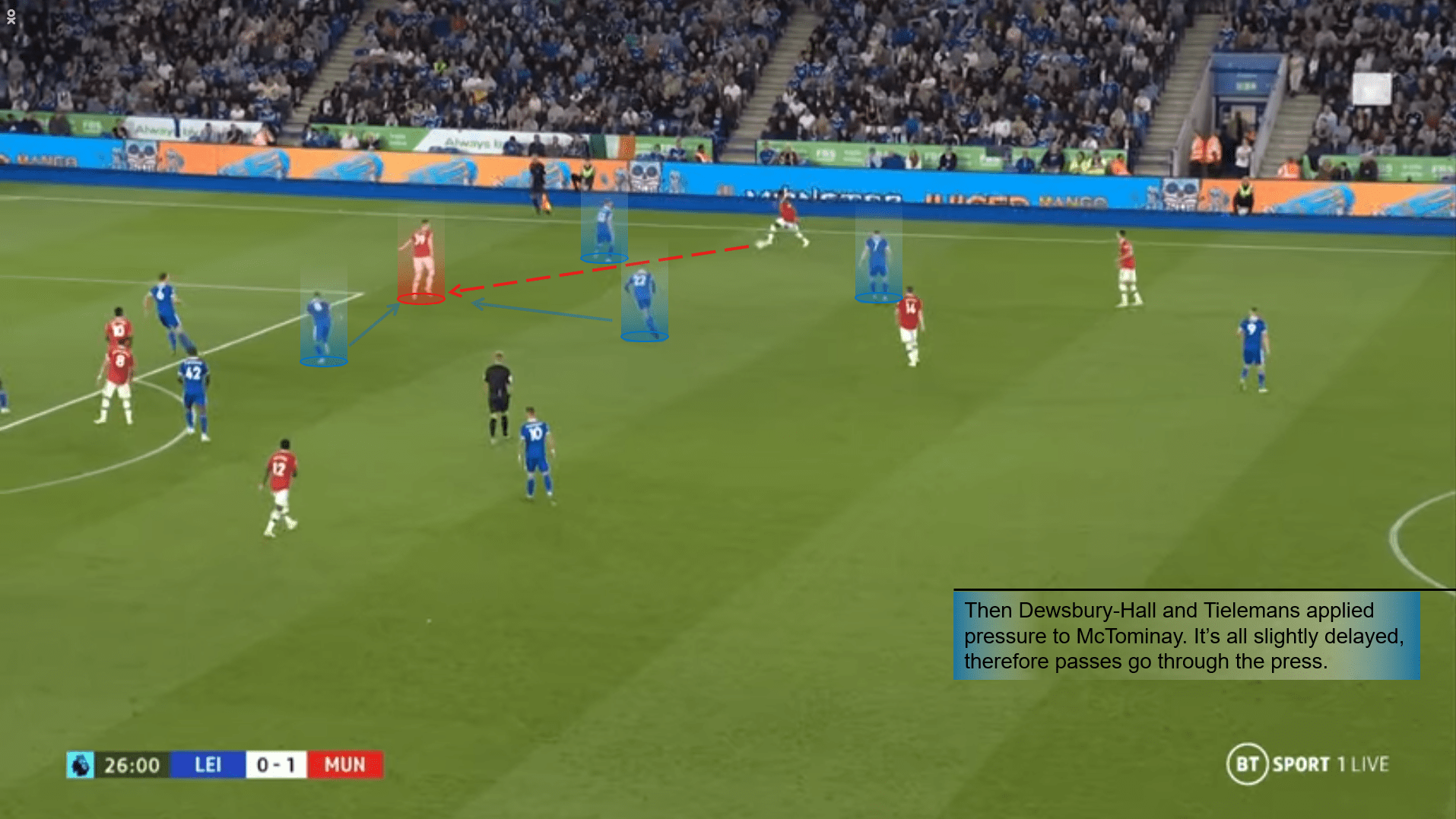 The domino effect of late presses from the likes of Thomas, Dewsbury-Hall and Tielemans meant that passing lanes remained open for every United player receiving possession, while those further ahead in the pressing shape – Barnes and Vardy – didn’t cover any players with their positioning or cover shadow combination. It made them useless in this phase of play.