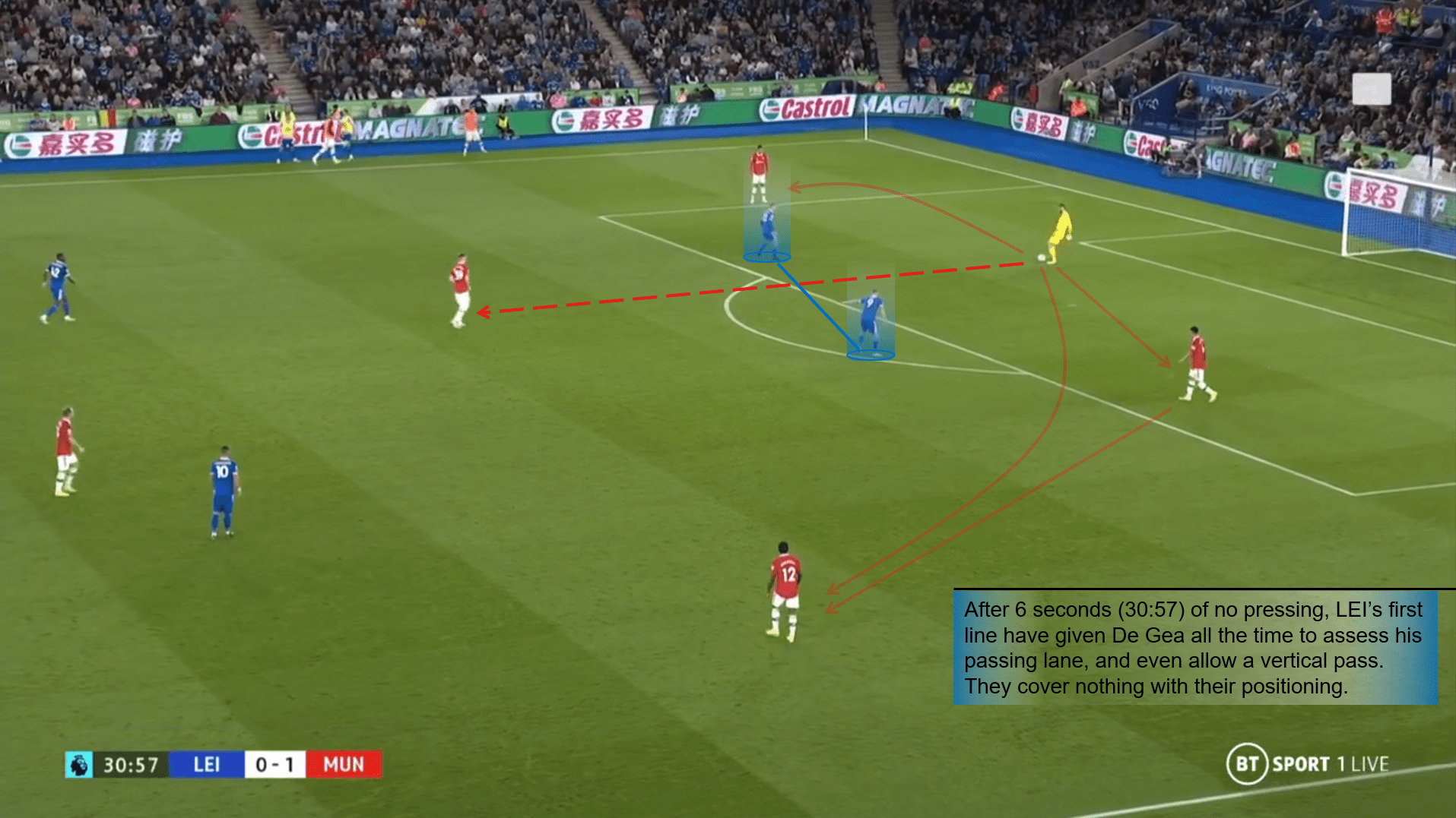 In the example illustrated below, Leicester placed the first two players of their pressing shape (Vardy and Dewsbury-Hall) high because De Gea was on the ball. Instead of using cover shadows and effectively “marking” some of his options by covering the space for a pass into them, while also putting pressure on the keeper by pressing him as well, the two players just sat high and were easily bypassed.