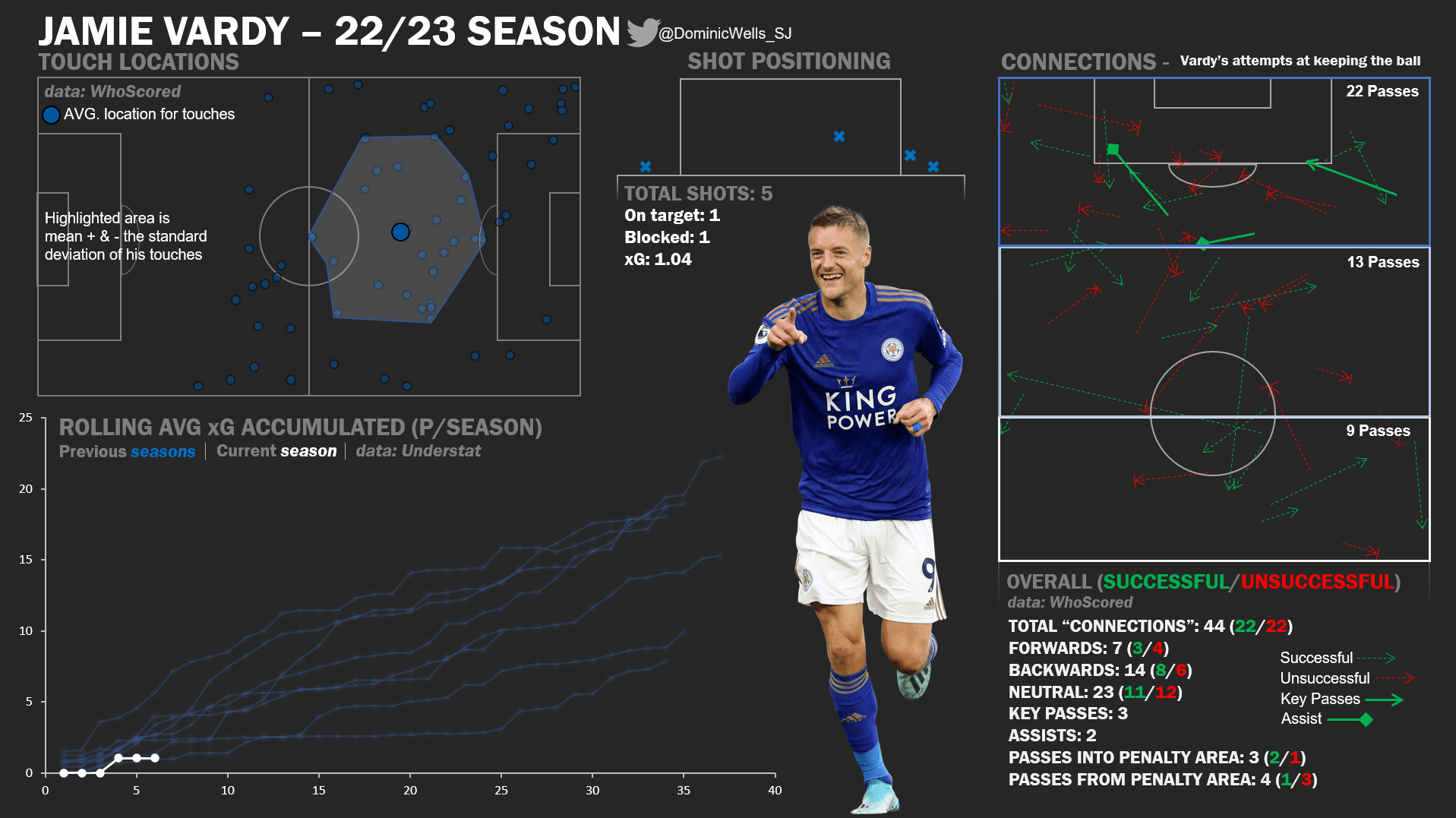 To get a better understanding of what’s going wrong for the talisman, I decided to create a dashboard to look at Vardy – addressing his locations for touches (as he’s the main receiving player of progression for Leicester, so ensuring he maintains the ball is of upmost importance to retaining possession with verticality), but also looking at his actual goal threat. Statistically, this is at its lowest point since the 2014/15 season, when Leicester were a newly-promoted Premier League club.