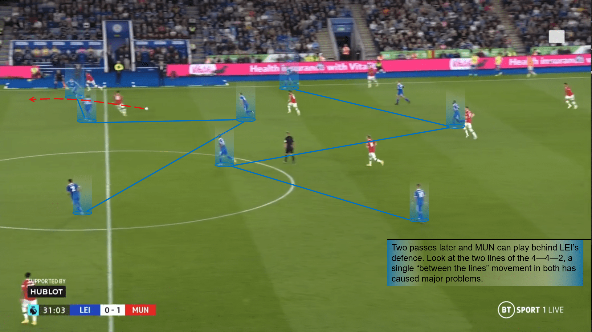 The structure here was very poor – these players are useless in the first line of the press and didn’t force any mistakes from United’s defenders. This resulted in easy progression through the pitch and eventually United found themselves in the final third, far too easily. Leicester struggled to replicate this building pattern because United’s players individually used cover shadows more proactively while pressing – it’s as simple as that.
