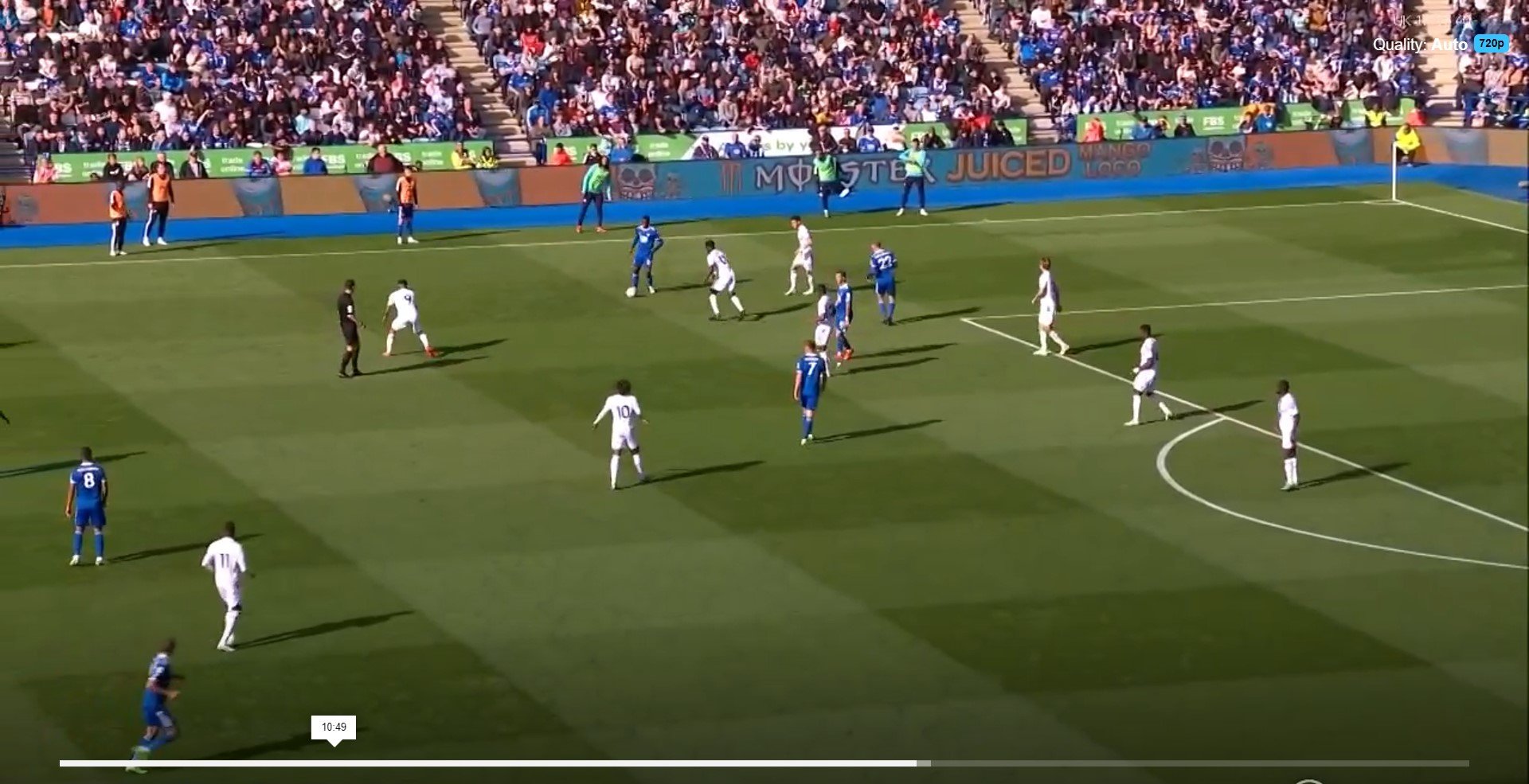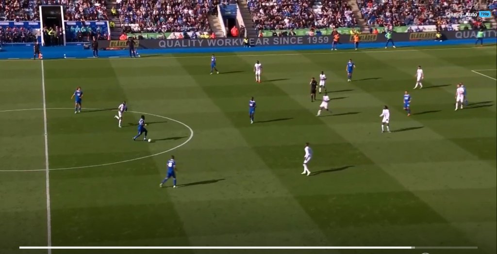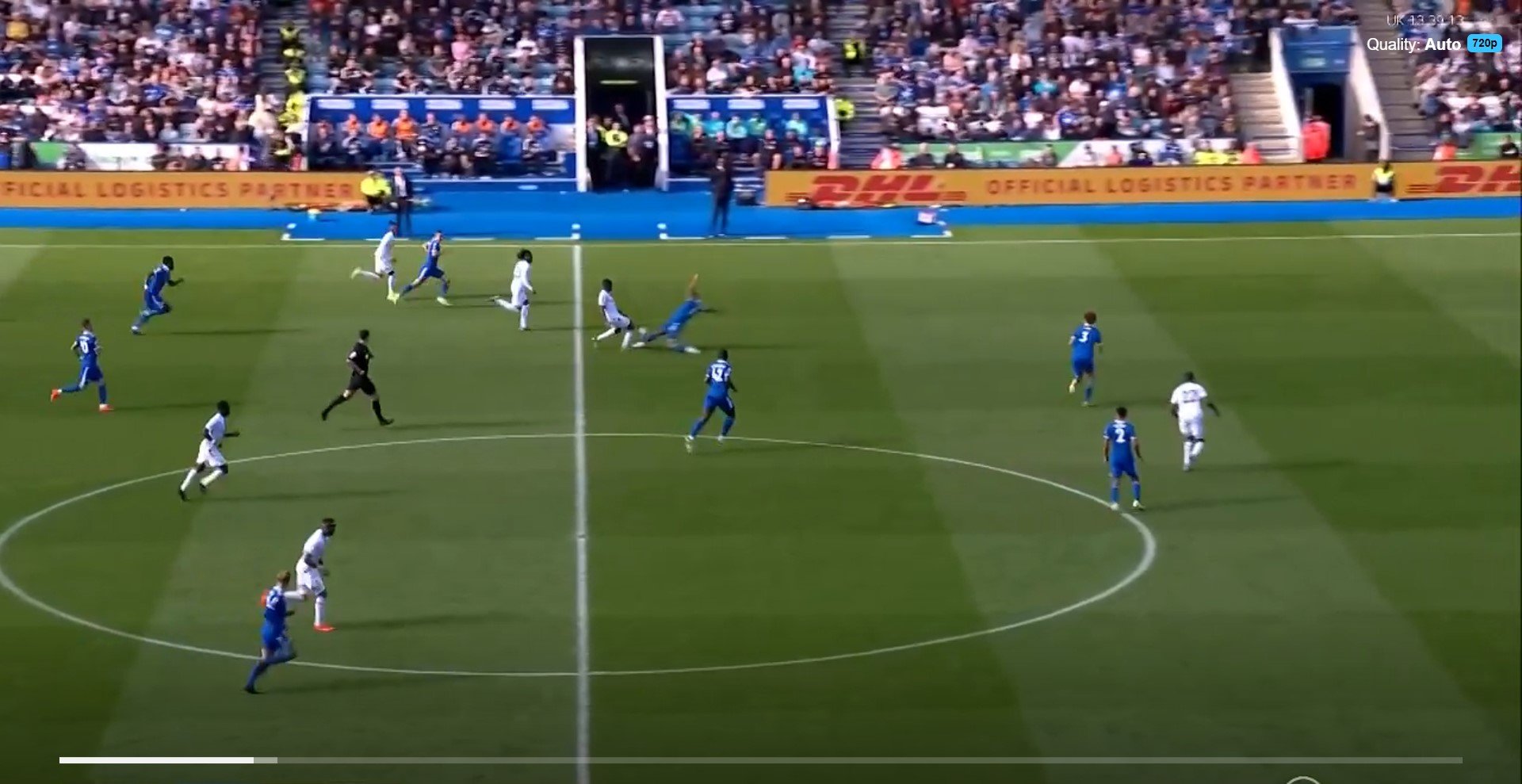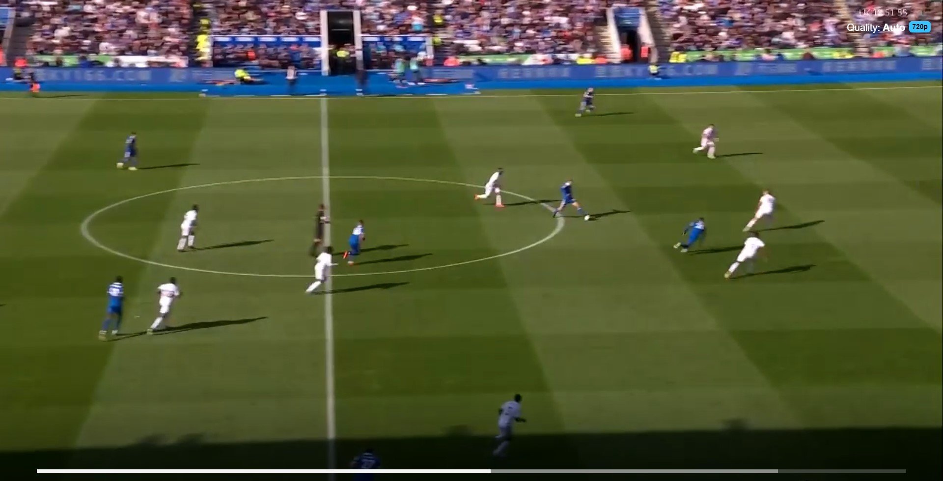 Dewsbury-Hall ultimately fed Daka, whose first time shot went out for a corner. This is something to look out for against Leeds: if Leicester can break the Leeds press there is going to be a lot of space for the attackers to work with. Kelechi Iheanacho (if he plays) is very good at receiving the ball to feet and the Tielemans –> Iheanacho supply line could be profitable.