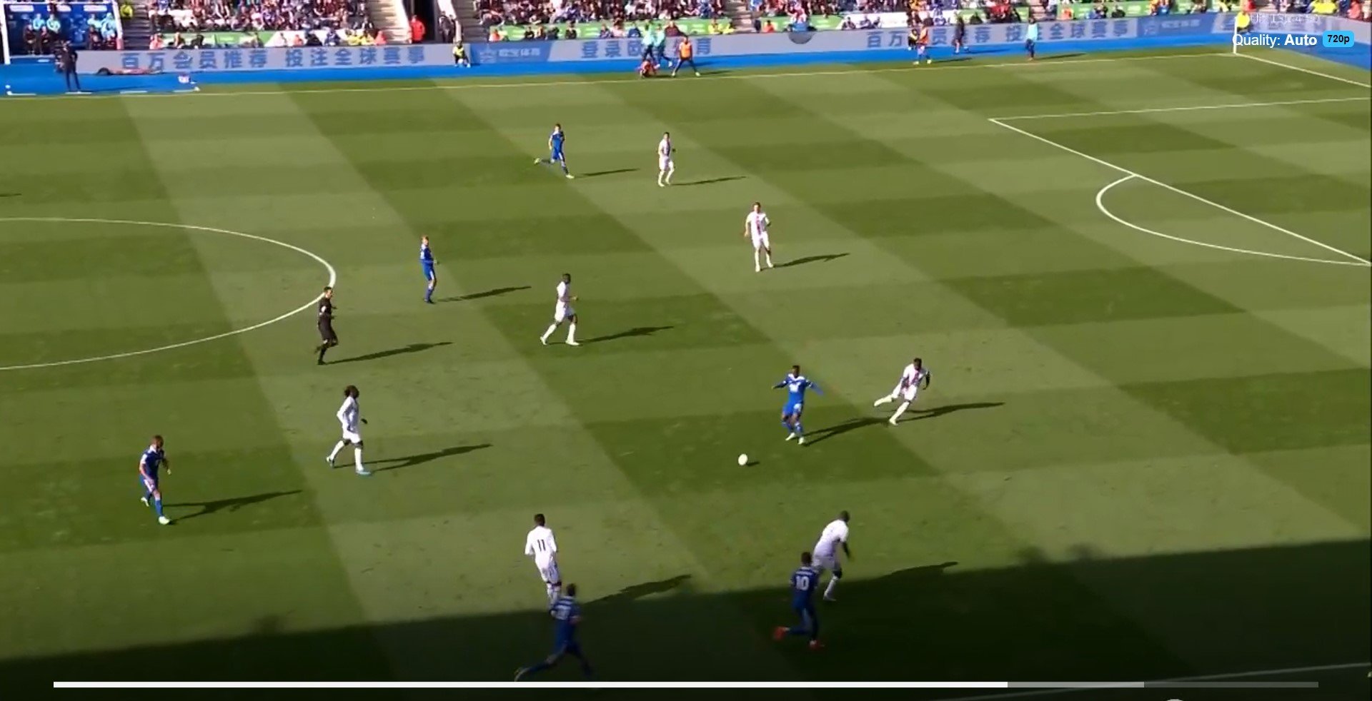 Despite the frustration in the stands, this patience was eventually rewarded with some nice attacking play. One of the attacking five, Dewsbury-Hall, overlaps down the left while the others make forward runs (Castagne’s head is in shot here bottom right).