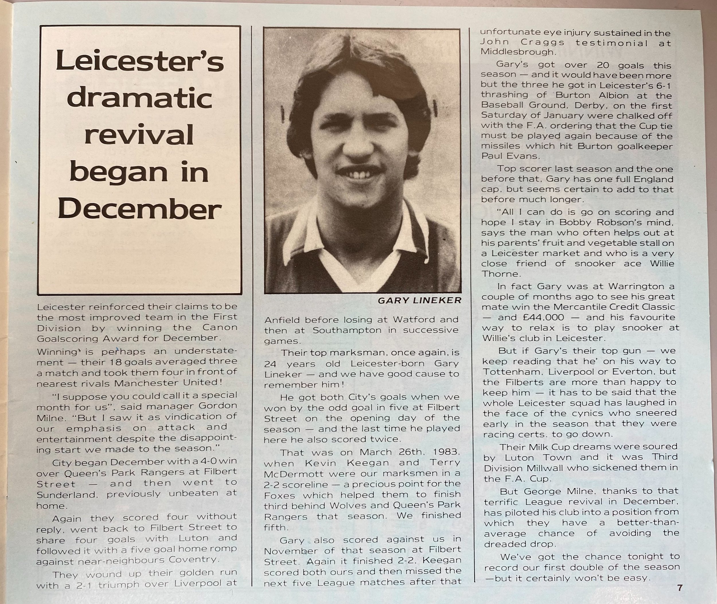 This would be the last time Lineker would score in an away win for Leicester, although he did subsequently score in defeats at Old Trafford and Loftus Road, as well as home wins over West Ham, Nottingham Forest and Sunderland before he was sold to Everton in the summer of 1985.