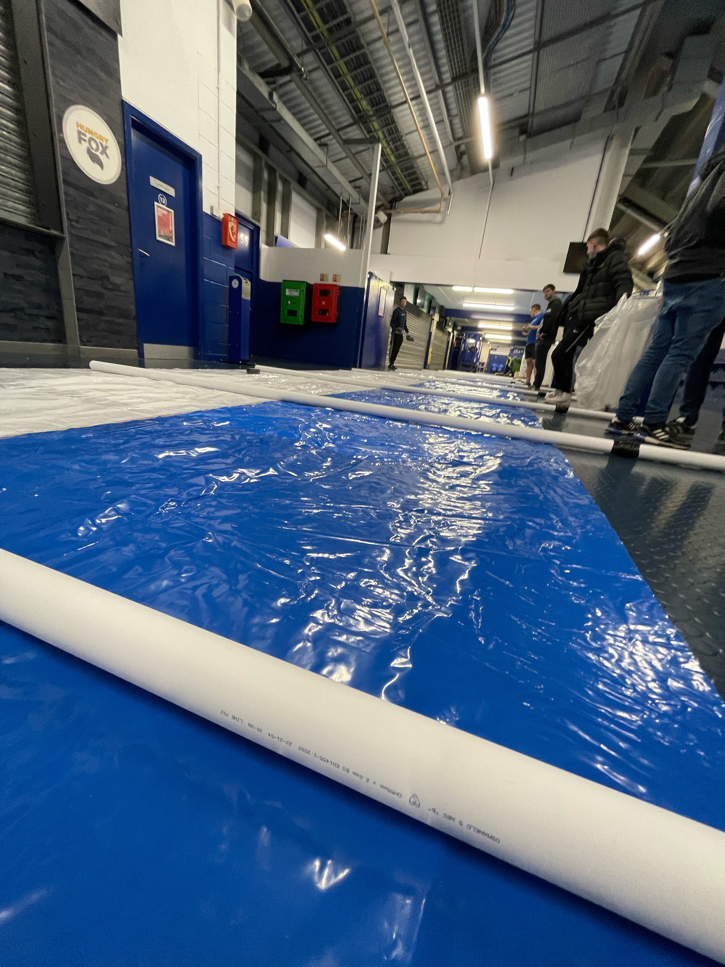Five of the group were in attendance to plot and cut out the black and yellow shapes using a 2x2m grid. This was for the Premier League trophy and the different parts of Morgan’s face. Base strips were then stuck using duct tape every three meters on the underside.
